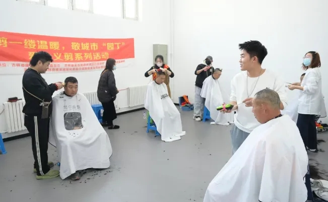 11月11日,长春市城市管理局举办了爱心义剪活动。理发师俯身轻声询问环卫工人:“要剪多长?”“鬓角这样修可以吗?”细致入微的关怀,开启了这场暖心服务。
